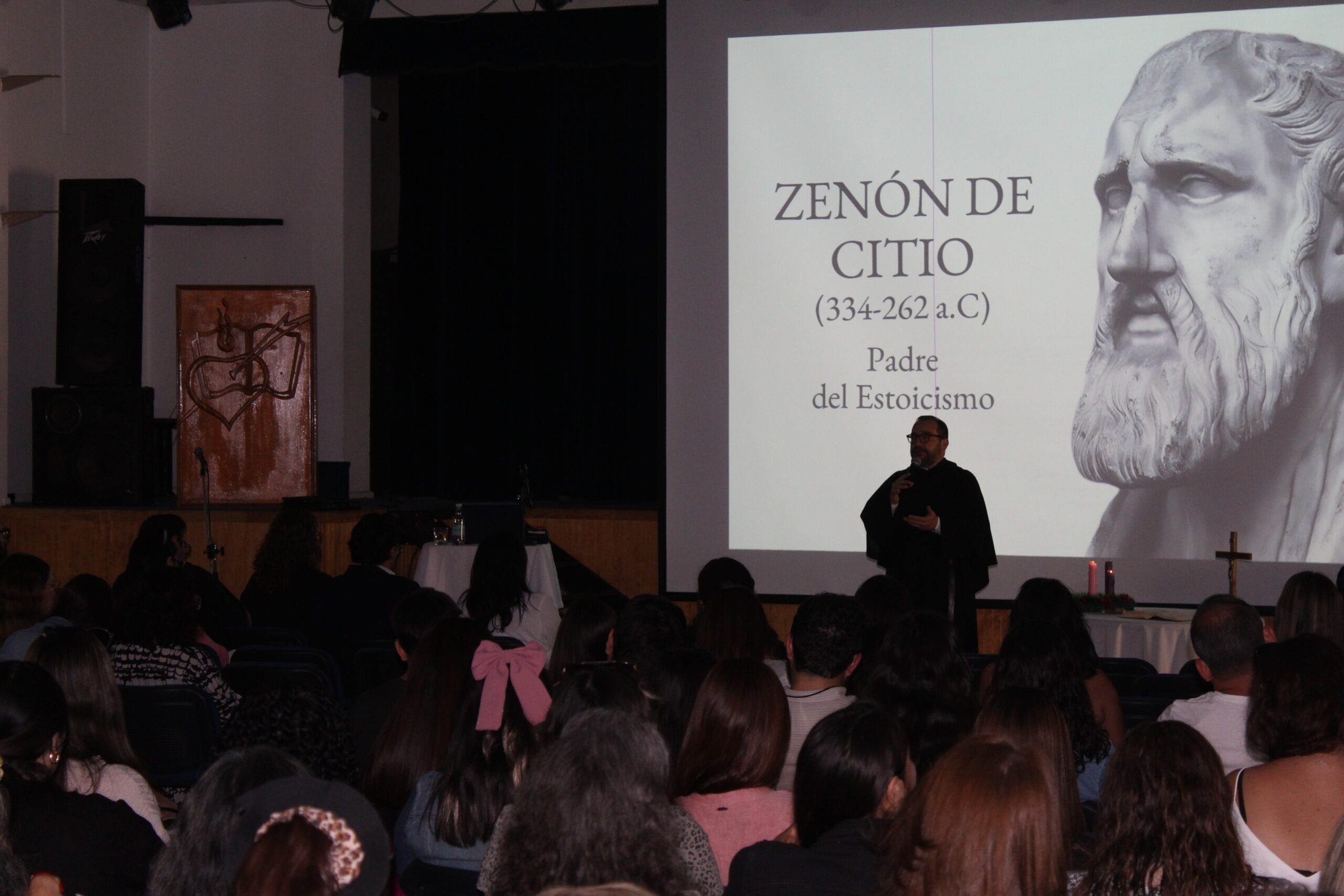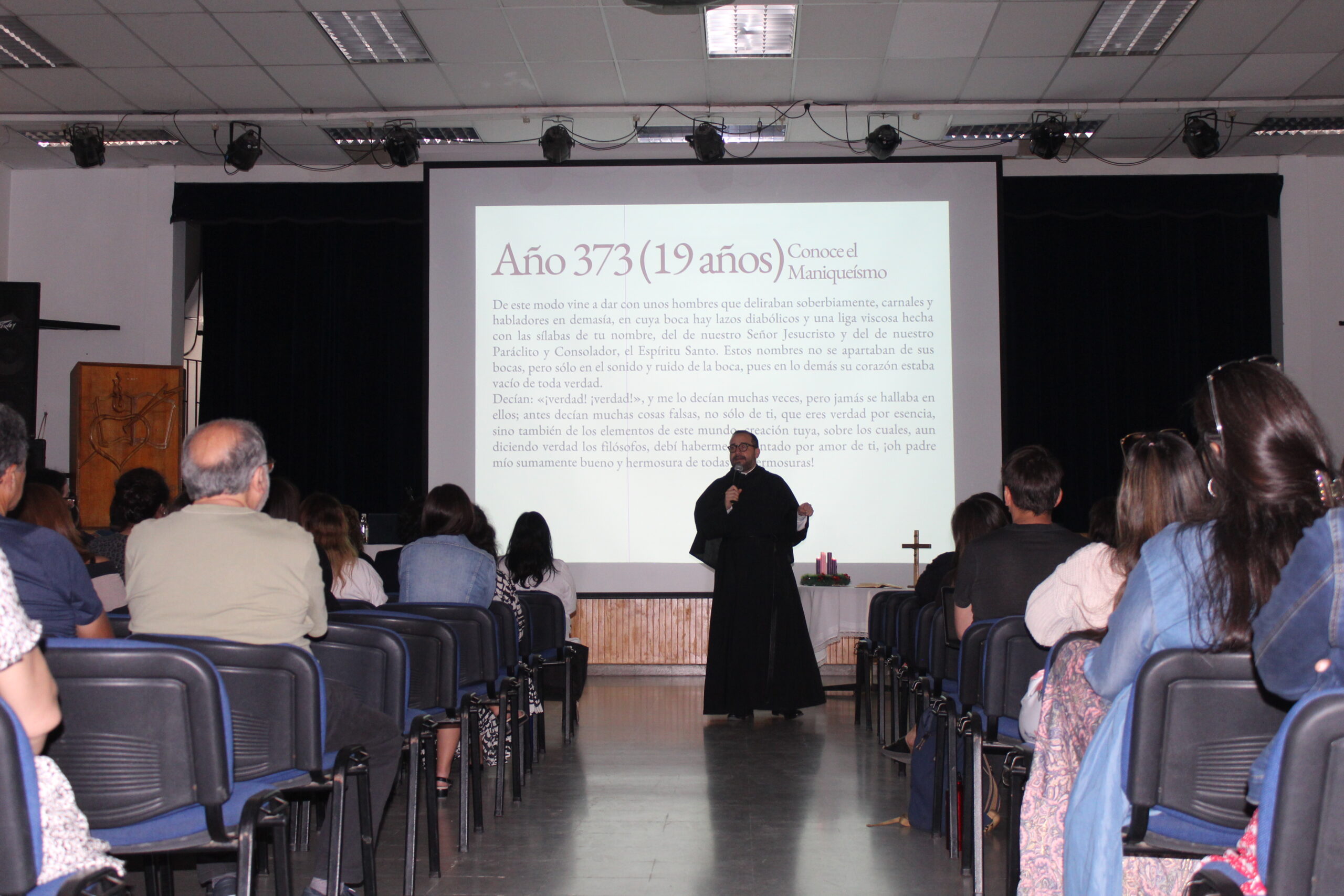 En síntesis, esta presentación, en el marco de la Formación Agustiniana, programada por la comunidad de Pastoral del colegio, cuyo director es Fr. Félix García, O.S.A., fue dividida en tres momentos: 1) Parte de la vida de san Agustín, su proceso interior, su búsqueda de la Verdad; para asociarlos con nuestros valores como institución educativa católica-agustiniana: la Interioridad, la Comunidad y la Libertad, los que deben entenderse en el contexto de la búsqueda de la Verdad y la espiritualidad de San Agustín; 2) destacados agustinos a lo largo de la historia de la Orden y 3) los agustinos en Chile, historia de nuestra casa de estudios, el carisma del estudio de los integrantes de la Orden agustina, e hizo recuerdos de algunos miembros señeros de esta, especialmente con la emotiva memoria del P. Clemente Farías Concha (+1916) y del P. Osvaldo Walker Trujillo(+ 1917). Ambos, muy queridos y emblemáticos sacerdotes, quienes también fueron rectores del colegio.